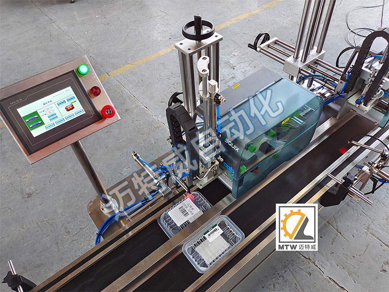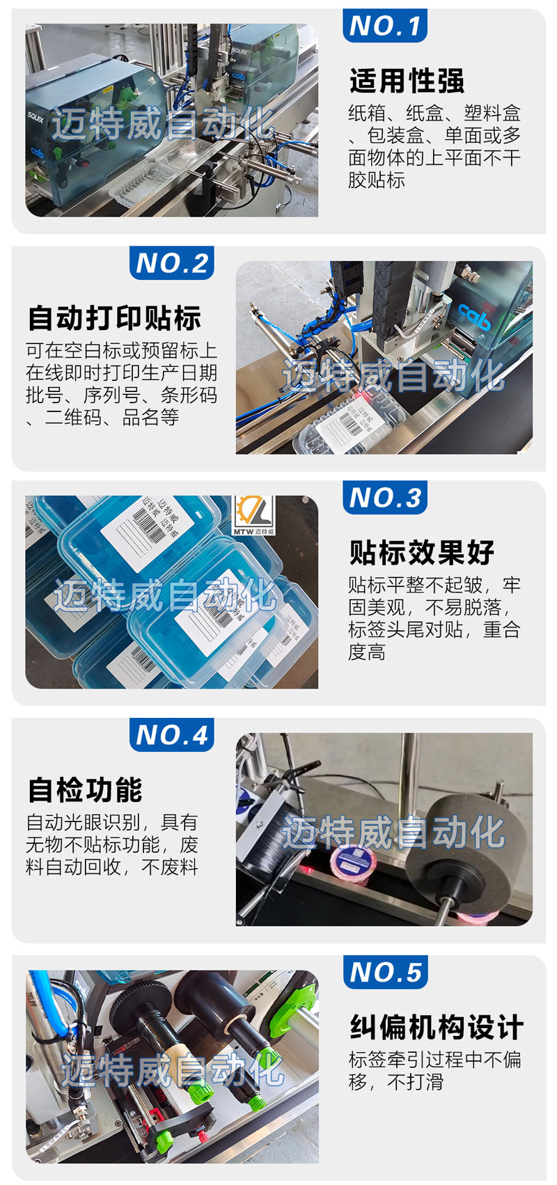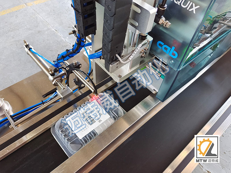 該設備用于瓶子、盒子、成型包、包裝箱等上平面的打印和貼標,可貼一張或兩張標。可在空白標或預留標上在線即時打印生產日期批號、序列號、條形碼、二維碼、品名、專銷區等預設內容并完成同步貼標。