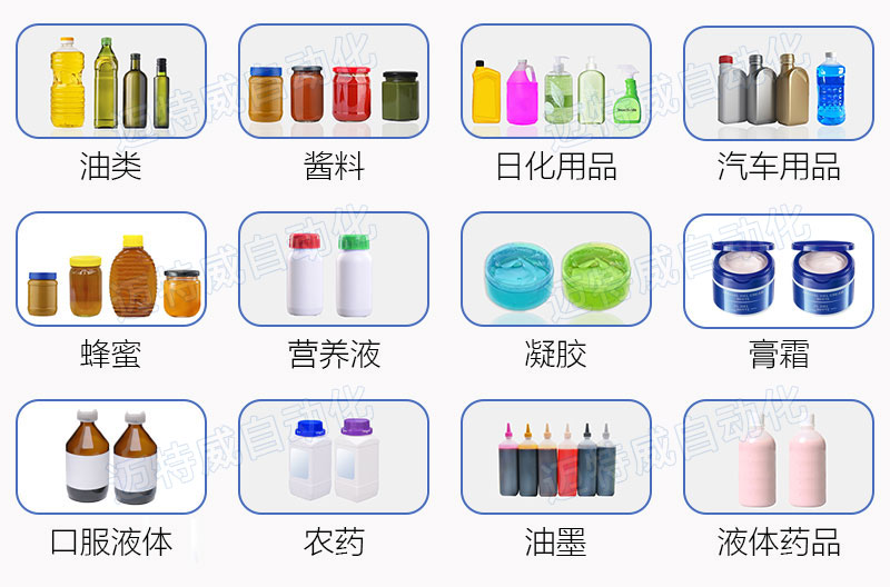 適用瓶型:玻璃瓶、塑料瓶、PP桶、PET瓶、馬口鐵桶、陶瓷瓶等。圓瓶,方瓶,六角瓶,八角瓶、錐形瓶等皆可灌裝。