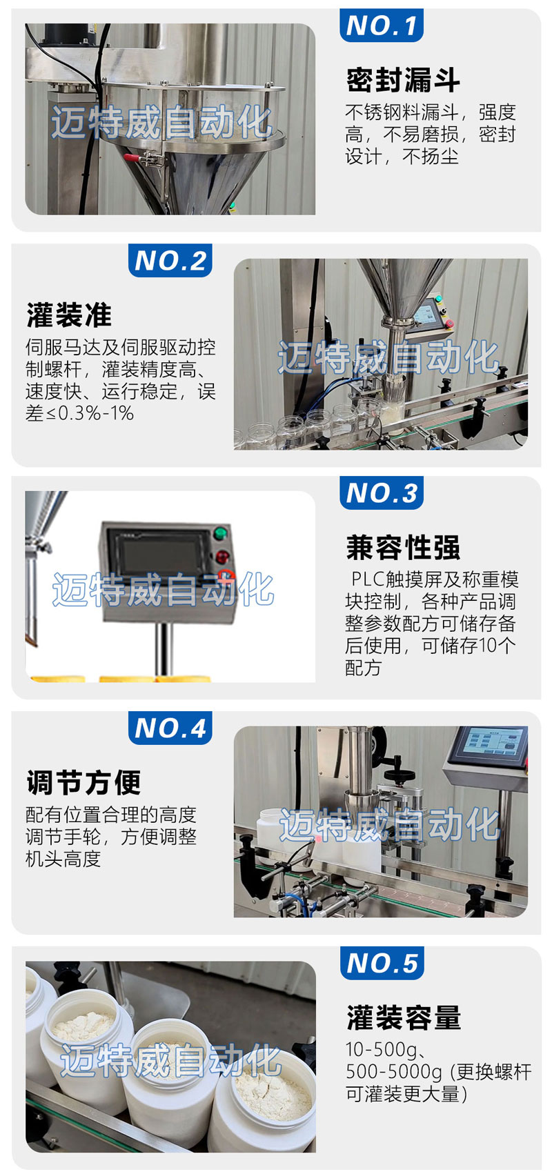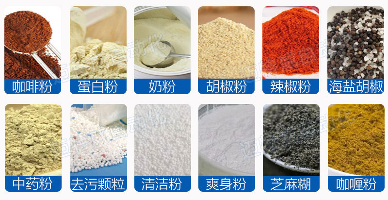 適用于包裝粉末、小顆粒藥品、奶粉、獸藥、調味品、粉粒狀添加劑、葡萄糖、固體飲料、爽身粉、農藥等瓶裝、聽裝及罐裝產品的自動定量灌裝。灌裝容量10-500 g、500-5000g (更換螺桿可灌裝更大量)。