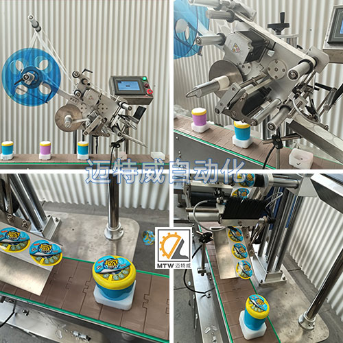 這款平面貼標機是針對這種特殊瓶設計定制的,輸送帶上加定位模具,固定產品,平面貼標,精度更高。