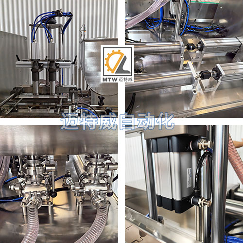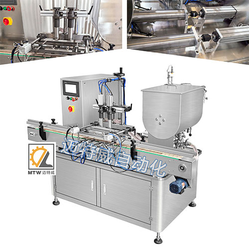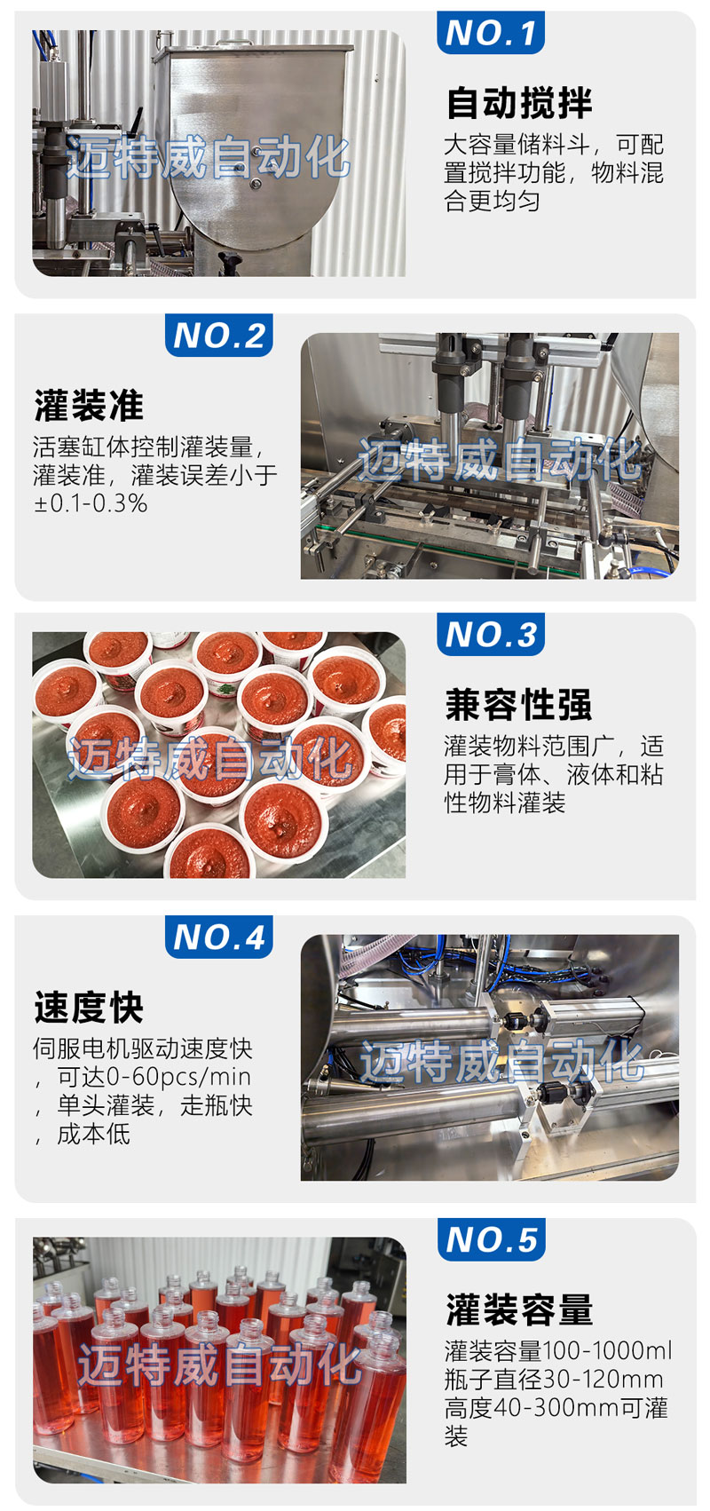 雙頭伺服灌裝機采用伺服活塞定量灌裝,單頭灌裝,設備投入少,走瓶速度快,效率高,灌裝容量100-1000ml,適用于醬料、膏體、液體和粘性物料灌裝。