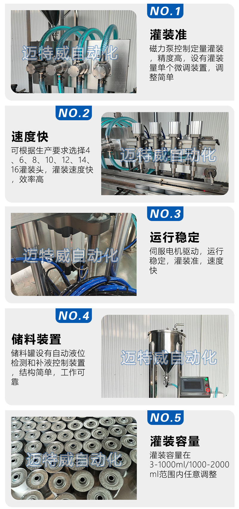 ● 采用磁力泵控制定量灌裝,精度高,設有灌裝量單個微調裝置,調整簡單,快捷準確;