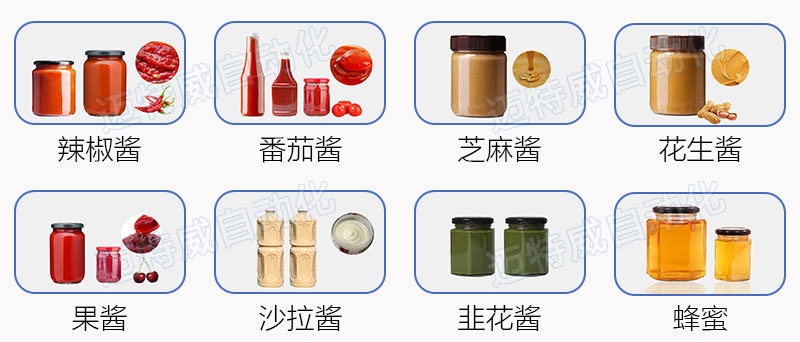 適用瓶型:適用于不同瓶型醬料在線自動灌裝, 如辣椒醬,芝麻醬,番茄醬,沙拉醬,果醬,花生醬,寵物醬料,蒜泥,韭花醬,蟹黃醬,調味料等粘稠醬類灌裝。