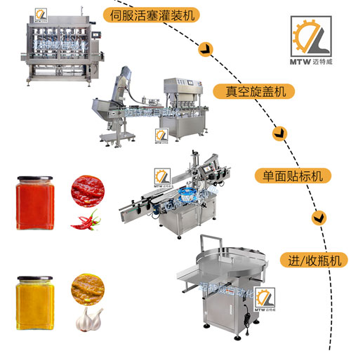 醬料灌裝生產線:伺服活塞灌裝機+真空旋蓋機+方瓶單面貼標機+收瓶機