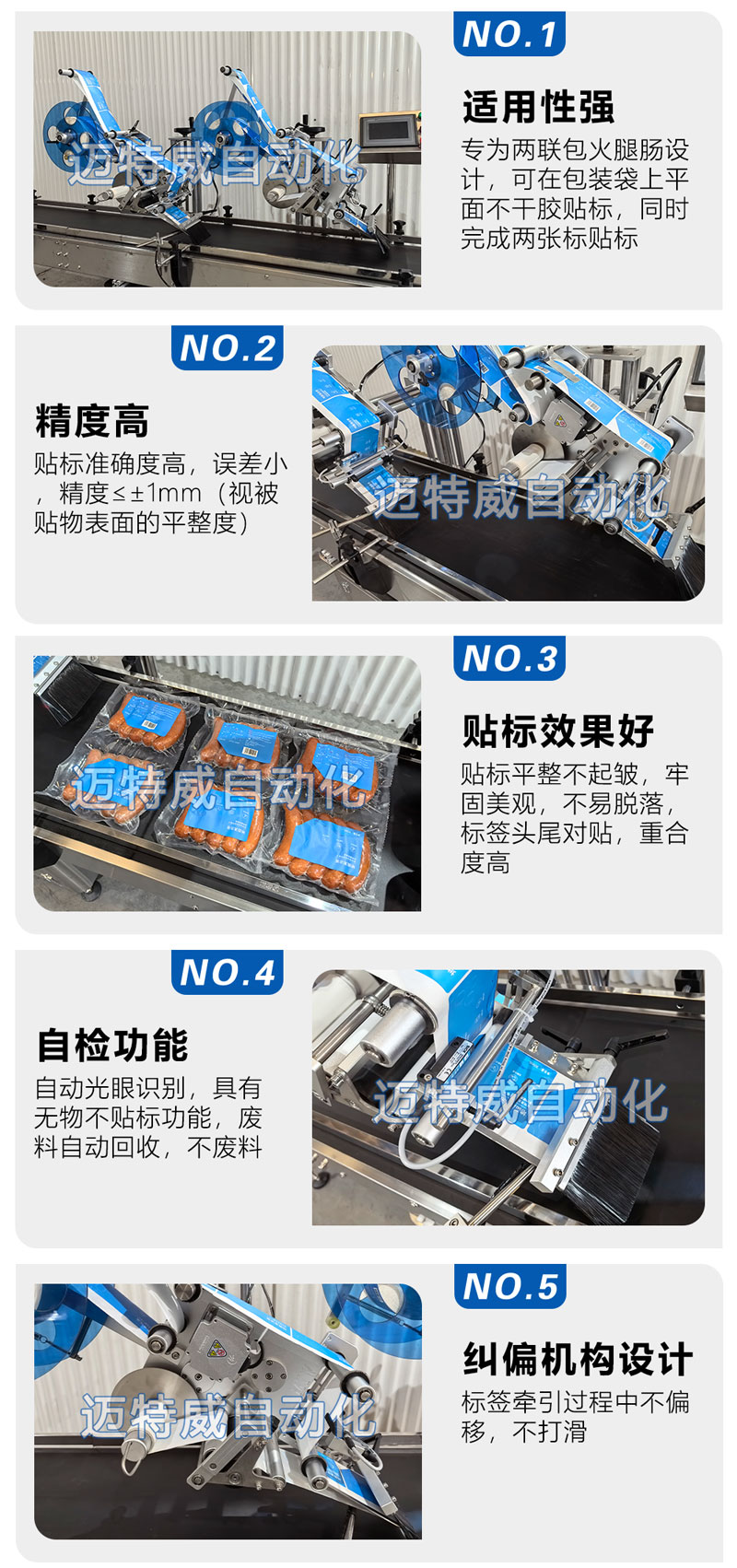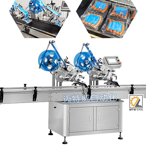 這款平面貼標機是針對這種兩聯包火腿腸包裝定制的,平面貼標,精度更高。