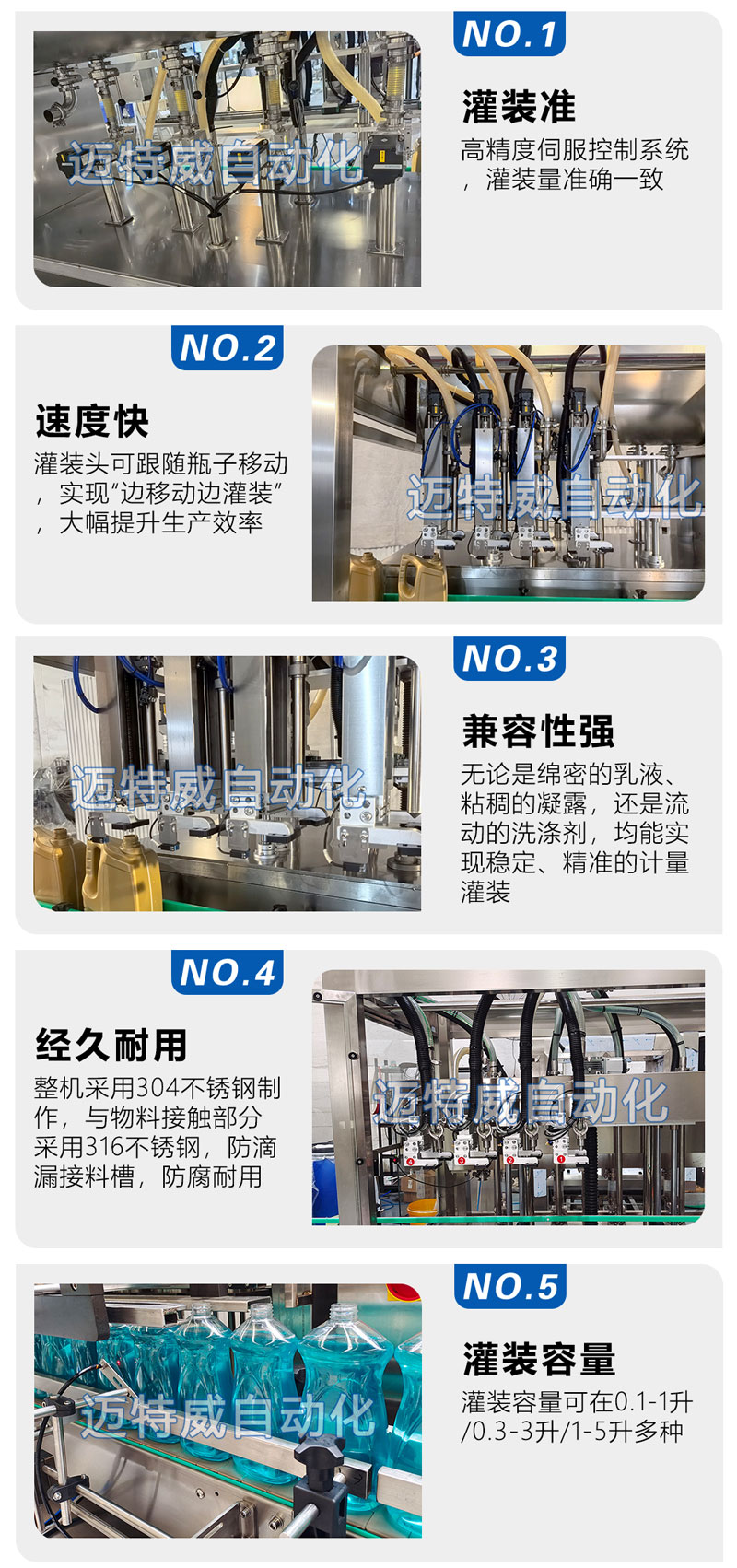 SF-G系列全自動(dòng)跟隨式灌裝機(jī)采用高精度伺服控制系統(tǒng),灌裝頭可跟隨瓶子移動(dòng),實(shí)現(xiàn)“邊移動(dòng)邊灌裝”,大幅提升生產(chǎn)效率。