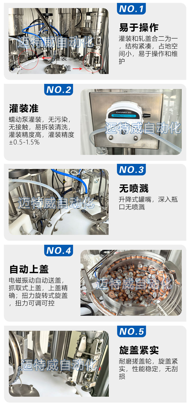 ● 電磁振動(dòng)自動(dòng)送蓋,三刀離心式軋蓋和扭力旋蓋,具有無瓶不灌裝的功能;