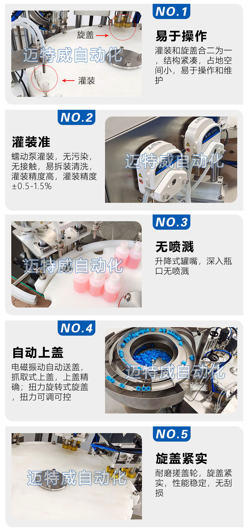 ● 采用高精度蠕動泵定量灌裝,電磁振動自動送蓋,伺服驅動旋蓋,具有無瓶不灌裝的功能;