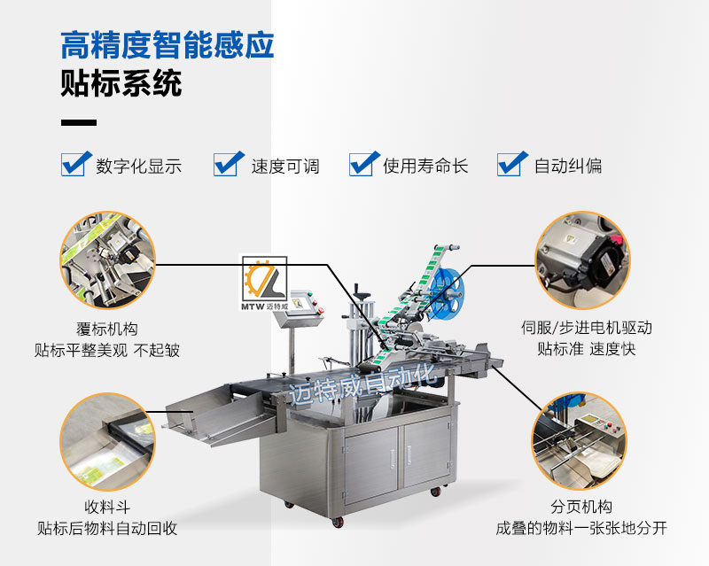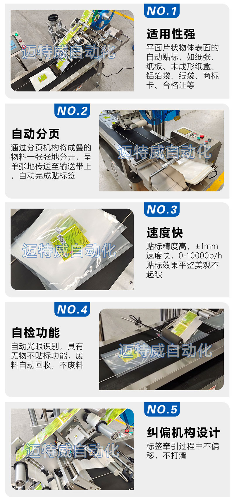 分頁貼標機主要適用于紙張、紙板、未成形紙盒、鋁箔袋、紙袋、商標卡、合格證等平面片狀物體表面的自動貼標。可加分頁機單機使用,亦可與其它機器組成聯動生產線。還可以根據生產需求在本機上配備打碼機、噴碼機,實現貼標和打碼同步完成。